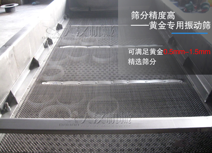 黃金的顆粒大小在0.5mm-1.5mm之間,我們大漢生產(chǎn)的不銹鋼直線振動(dòng)篩能滿足細(xì)至0.028mm以細(xì)顆?;蚍勰钗锪虾Y分,粗至5mm大顆粒塊狀物料的篩分,其中多層的篩網(wǎng)安裝也能夠達(dá)到同時(shí)篩出不同規(guī)格物料的要求,適應(yīng)多種規(guī)格的生產(chǎn)標(biāo)準(zhǔn)。而且不銹鋼直線振動(dòng)篩還配備有彈跳球,在篩分過程中不停撞擊篩網(wǎng),達(dá)到清網(wǎng)的目的,網(wǎng)孔不會(huì)堵塞,滿足精度的同時(shí)還能保證篩分效率。
